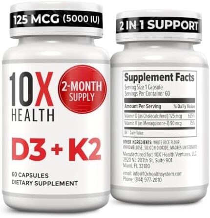 10X Health Vitamin D3 5000 IU & K2 MK7 – Menaquinone 7, High-Potency D3 K2 Vitamin Supplement for Bone Health, Heart and Teeth – 125 mcg Vitamin D & 90 mcg Vitamin K2-60 Capsules