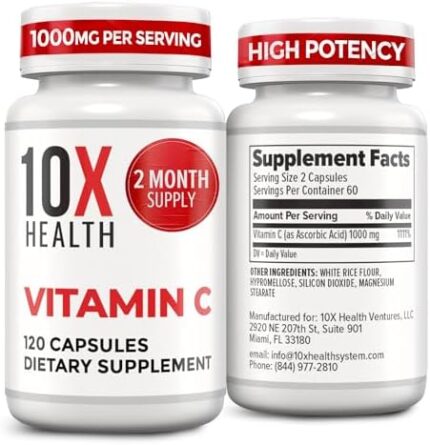 10X Health Vitamin C 1000mg – 120 Capsules Vitamin C, High Dose Ascorbic Acid for Immunity, Antioxidant Protection, Collagen & Tissue Support for Adults – VitaminC 1000 mg – Non-GMO, Gluten-Free