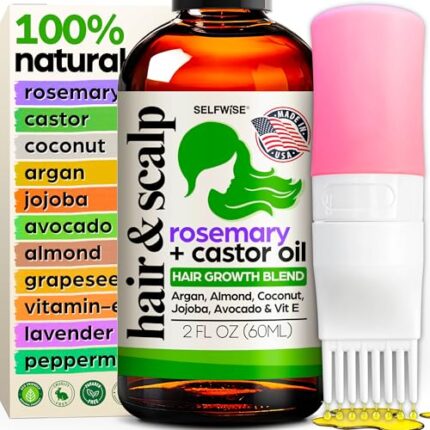 Organic Rosemary Oil For Hair Growth + Applicator with Castor, Argan, Coconut, Almond, Jojoba, Avocado, Vitamin E & Peppermint for Hair & Scalp Treatment, All Hair Types, Men & Women 2oz
