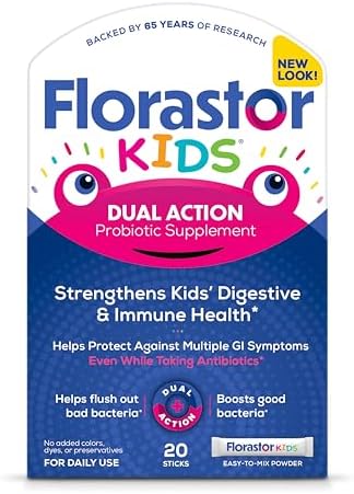 Florastor Kids Dual Action Probiotic Supplement, Strengthens Kids’ Digestive & Immune Health, 20 Easy-to Mix Powder Sticks, Packaging May Vary