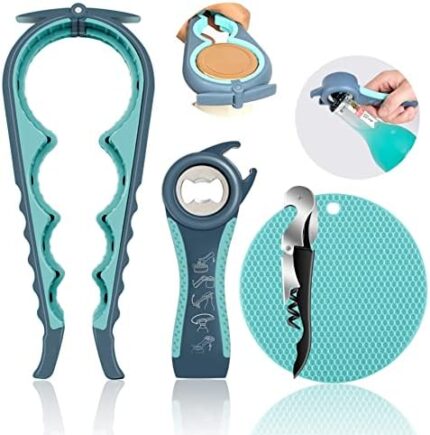 Jar Opener for Weak Hands, Seniors with Arthritis, 5 in 1 Multi Function Bottle Opener Lid Opener For Arthritic Hands with Non Slip Rubber Jar opener Gripper Pad and Corkscrew Wine Opener(BLUE)