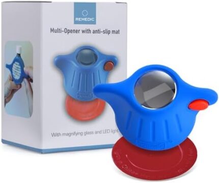 Remedic Medicine Bottle Opener with Magnifier & LED Light – Easy Grip Aid for Weak Hands – Non-Slip Mat for One-Handed Use – Arthritis-Friendly Multi-Opener – Senior Care Tools