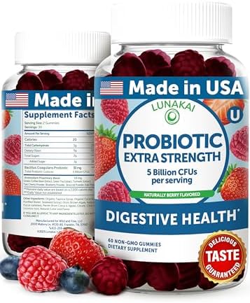 Lunakai USA Made Probiotic Gummies – 5 Billion CFUs, Vegan, Non-GMO, Gluten-Free – Digestive & Immune Support for Women & Men – 60 Chewable Gummies