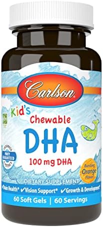 Carlson – Kid’s Chewable DHA, 100 mg DHA, Brain & Vision Function, Growth & Development, Orange, 60 Chewable Softgels
