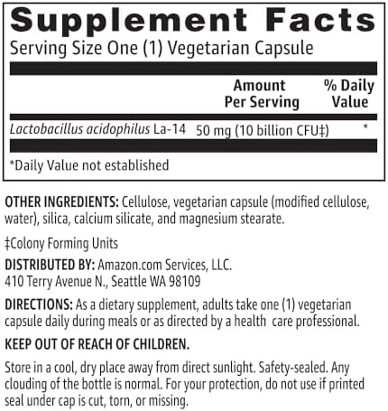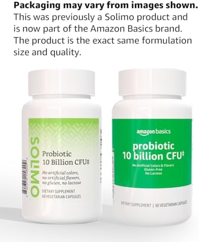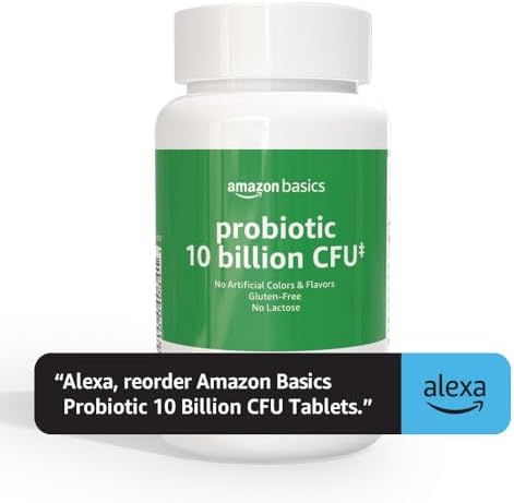 Amazon Basics Daily Probiotic vegetarian capsules are formulated for men and women and contain no artificial flavors, gluten, or lactose. Each serving contains 10 billion CFU (colony forming units) probiotics per serving. Adults take one daily with food as a dietary supplement.
