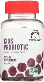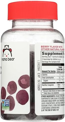 Mama Bear Probiotic Gummies have yummy berry flavors so they’re fun for kids to take. And they’re non-GMO, vegan, and gluten free. Kids 2–3 years of age take 1 gummy daily (1 billion CFU per serving), kids 4+ take 2 gummies daily (2 billion CFU per serving). Chew thoroughly. Keep bottle out of reach of children.