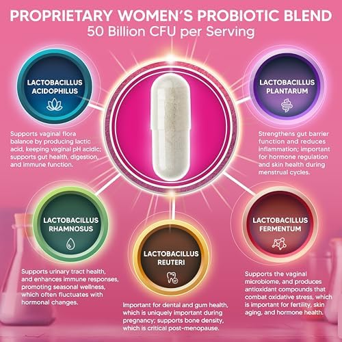 50 Billion CFU Women’s Probiotic: This high-strength women’s probiotic supplement delivers 50 Billion CFU per serving with 5 premium Lactobacillus strains to support gut health, vaginal flora balance, urinary tract wellness, digestive comfort, and immune system function. Ideal for daily feminine wellness and microbiome support.