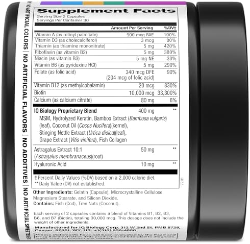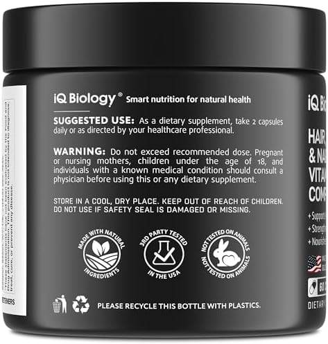 Hair Loss & Thickness Support – Each capsule provides Biotin 5000mcg with Collagen and Keratin to strengthen and thicken hair from the inside out (biotina y colageno in Spanish). Unlike topical products, Biotin pills work from within and, when combined with external care, help reduce breakage and thinning for visibly stronger hair. Trust IQ BIOLOGY womens hair vitamins and men’s Biotin formula to deliver essential nutrients.