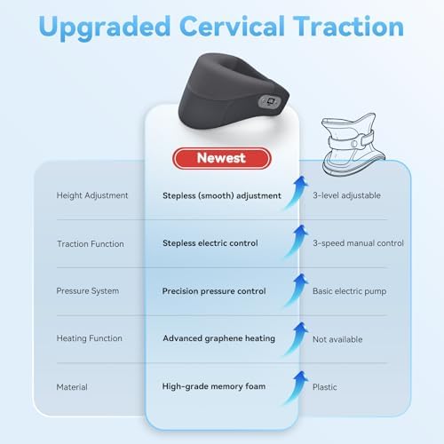 𝗦𝘁𝗲𝗽𝗹𝗲𝘀𝘀 𝗛𝗲𝗶𝗴𝗵𝘁 𝗔𝗱𝗷𝘂𝘀𝘁𝗺𝗲𝗻𝘁 – The cervical traction device offers fully adjustable height settings via an electric knob, making it suitable for various stages of cervical spine issues. Additionally, it features wide Velcro straps that customize the fit to your neck, helping to relieve tension and stress caused by poor posture