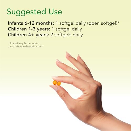 Daily Dosage for Optimal Health – Infants 6-12 months: 1 softgeldaily (open softgel). Children 1-3: 1 softgel daily. Children 4+: 2 softgels daily
