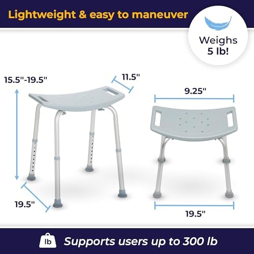 Comfortably Supports Up to 300 Pounds: Bath bench dimensions: Width: 19.25 Inches x Length: 11.5 Inches; Seat Height: 14″ Inch – 12″ Inch; Weight capacity: 300 pounds
