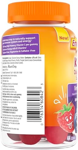 Emergen-C Kidz Daily Immune Support (1) Dietary Supplements for kids are an easy and delicious way to support your child’s immune system and energy (1). Emergen-C Kidz gummies offer everything you love about original Emergen-C gummies, but formulated especially for children. These gummies contain a variety of essential nutrients, including 250 mg of high potency vitamin C per gummy for immune system support and B vitamins to enhance energy naturally (1). These gummies come in fun, kid-approved berry flavors, plus they’re gluten free, caffeine free and vegetarian. Give your child these dietary supplement gummies under adult supervision as directed. Emergen-C Kidz supplements come in a bottle of 44 gummies. Transform every day with vitamin C from Emergen-C. (1) This statement has not been evaluated by the Food and Drug Administration. This product is not intended to diagnose, treat, cure, or prevent any disease.