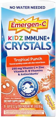 Emergen-C Kidz Immune Plus Crystals, On-The-Go Immune Support Supplement with Vitamin C, Vitamin D, B Vitamins, Zinc and Manganese, Tropical Punch, Back to School Essentials – 28 Stick Packs