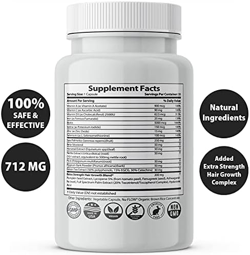 Highly effective combination of other clinically proven extra strength ingredients such as Horsetail, Nettle Extract, Fo-TI, Pygeum Bark Powder and Green Tea Extract, Pumpkin Seed Extract, Lycopene, Fenugreek, Ashwagandha, Full Spectrum Palm Extract, & Hyaluronic Acid to help regenerate failing hair follicles, regain your hair, fight hairloss thinning, & boost your nutrition & health care. 1 month supply per bottle, stimulator & thickener.