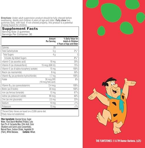 Flintstones picky kids + iron gummy vitamins: With key nutrients to support healthy growth and development* for kids ages 4+. Each bottle contains multivitamin gummies in a yummy natural grape flavor with other natural flavors picky kids will love
