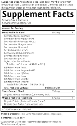 DOCTOR FORMULATED PROBIOTICS: These mood probiotics supplements provide 50 Billion CFU and 16 Probiotic Strains including Clinically Studied probiotics, plus 350 mg of Organic Ashwagandha and Alaskan Blueberry for occasional stress management*