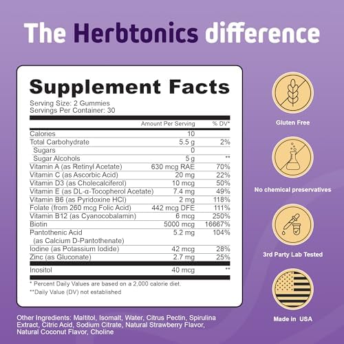 All-in-One Hair, Skin and Nails Gummies: Herbtonics comprehensive Hair, Skin and Nails Vitamins formula includes Biotin, Folic Acid, Vitamins A, C, E, B5, B6, and B12 – essential nutrients that promote hair growth, reduce breakage, and combat thinning. Our potent blend revitalizes your cells, promoting youthful, radiant skin and a refreshed appearance.
