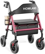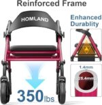【Durability & Foldable】Homland walkers for seniors engineered with reinforced Aluminum Alloy frame and double support bars (Max user recommend: 350 pounds), Our 4 wheel rollator just 17.6lb, The rollator walker with seat featured 3-second quick folding design facilitates easy transport and storage, easy lift into your trunk