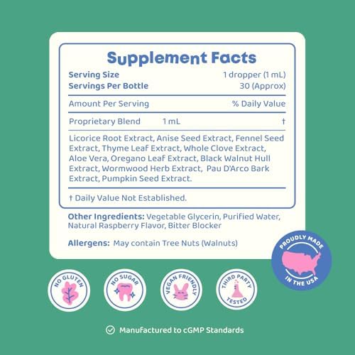 Comprehensive Herbal Blend This formula includes black walnut hull, wormwood, clove, oregano, licorice root, fennel seed, pumpkin seed, anise seed, thyme leaf, aloe vera, and pau d’arco. Together, these botanicals create a well-rounded blend in a child-friendly liquid supplement.