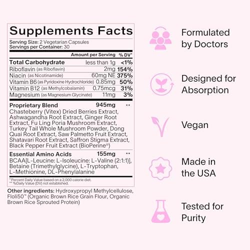Natural Answer for Period Relief: This robust women’s formula targets even the most stubborn symptoms. Expertly formulated with ingredients like chasteberry, ashwagandha, black cohosh, B vitamins, wild yam, saffron, shatavari, B vitamins, and more.
