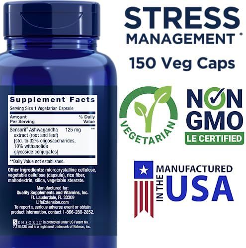 LifeExtension Optimized Ashwagandha 125mg per capsule, Sensoril Ashwaganha Extract (Root and Leaf), 150 ct