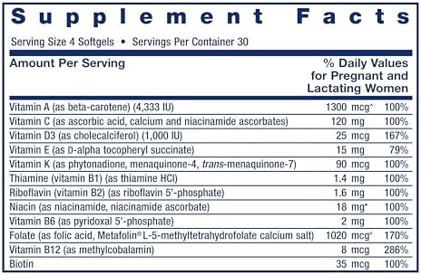 Prenatal Advantage is a complete multivitamin for healthy moms and babies. It delivers the bioactive forms of folic acid (as 5-MTHF), DHA, choline, vitamins A, C, D3, K, B12, B1, B6, and minerals like iron, zinc, copper, potassium, chromium and more—all essential to supporting mom’s health and baby’s development during pregnancy and breastfeeding. Prenatal Advantage contains 120 gluten-free softgels, enough for a 30-day supply.