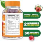 500 mg per Serving: This bottle contains 60 calcium d3 gummies. Each serving consists of 2 gummies, equaling 30 servings of bone strength supplements. Each serving has 500 mg of calcium and vitamin d 25 mcg.