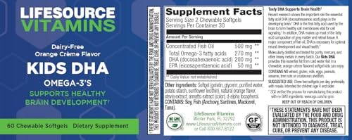 Support your child’s brain and eye development with LifeSource Vitamins Kids DHA Omega 3’s. These delicious orange creme-flavored softgels are packed with essential omega-3 fatty acids, ensuring your child gets the nutrients they need for optimal growth. Key Benefits: Brain Health: Contains 200 mg DHA and 50 mg EPA per serving to support healthy brain development and cognitive function. Eye Health: Promotes healthy eye function and retinal growth. Immune Support: Strengthens the immune system with high-quality fish oil. Purity & Safety: Molecularly distilled and tested for PCBs, dioxins, and heavy metals to ensure purity and safety. No Allergens: Free from artificial flavors, preservatives, wheat, gluten, milk, eggs, peanuts, tree nuts, and shellfish. Directions: Chew or swallow one softgel daily. Ingredients: Includes 200 mg DHA, 50 mg EPA, and 500 mg of fish oil per serving. Made in the USA.