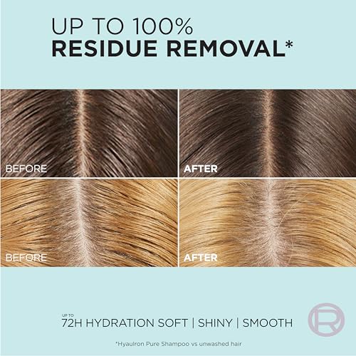 Purifying and Rehydrating Routine: Gently exfoliate with the Hyaluron + Pure Oil Erasing Serum Scalp Treatment. Then, clarify with the Hyaluron + Pure 72H Purifying Shampoo. Finally, rehydrate with the Hyaluron + Pure 72H Rehydrating Conditioner
