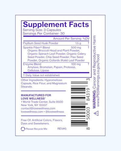 REGULARITY & DIGESTIVE SUPPORT: Love Wellness Sparkle Fiber helps gently support normal detoxification for digestion, immunity, and overall health.* This fiber supplement powder is a unique combination of fiber, psyllium husk, antioxidant-packed veggies, and superfoods that help support regularity and digestion.* Serving size 3 capsules, 30 servings per container.
