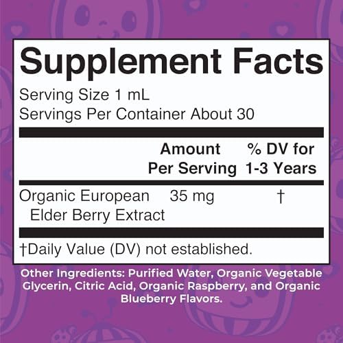 Per Serving (7 Drops): 35 mg Organic European Elder Berry Extract. Other Ingredients: Purified Water | Organic Glycerin | Organic Citric Acid | Organic Natural Raspberry and Blueberry Flavors.