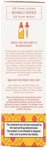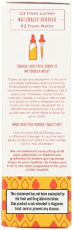 Vitamin D3+K2 (MK-7): Support your growing toddler’s bone health with these important vitamins. Help promote calcium absorption and support vitamin levels with these easy-to-take, unflavored drops.