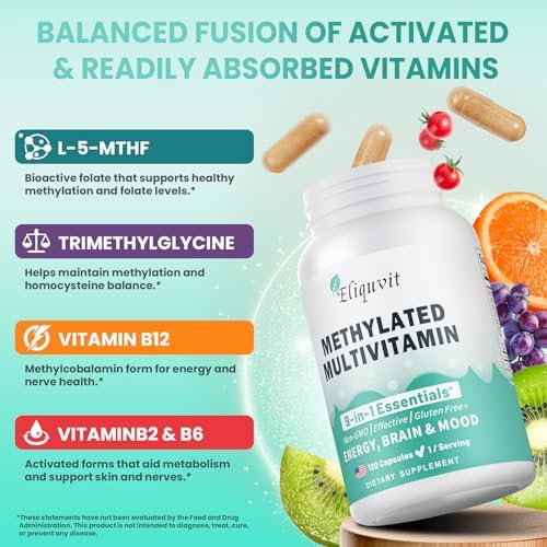 Eliquvit Methylated Multivitamin – A 9-in-1 Methylated B Complex with vitamins B2, B6, B9 (as L-Methylfolate), B12 (as Methylcobalamin), C, D3, E, K2, and Trimethylglycine (TMG) in one daily capsule. Formulated for men and women, this methylated multivitamin uses bioactive nutrients to support energy, methylation cycles, and overall wellness
