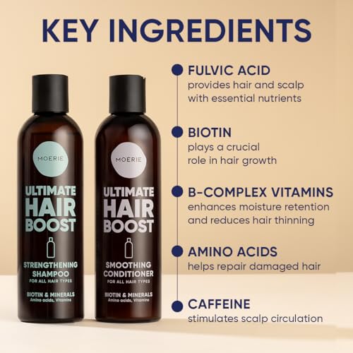 100 Vital Nutrients Work Together: Every ingredient in your Moerie Hair Growth Shampoo and Conditioner has a special purpose; Biotin plays a vital role in hair growth by boosting keratin production; Caffeine has stimulating properties; B-complex vitamins support healthy hair growth; etc.