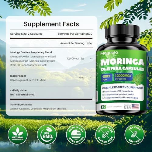60-Day Supply: Each organic moringa capsule contains 12000mg of Moringa leaf extract, providing powerful nutritional support with just 1 capsule per day. Each bottle contains 60 capsules, offering a full 60-day supply.