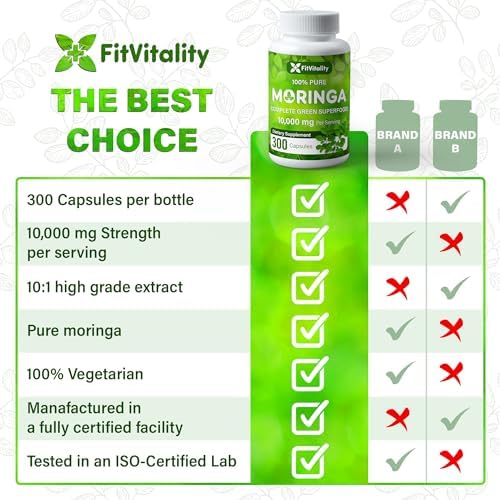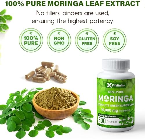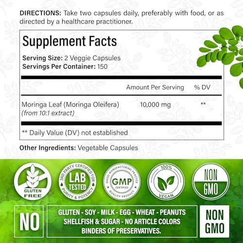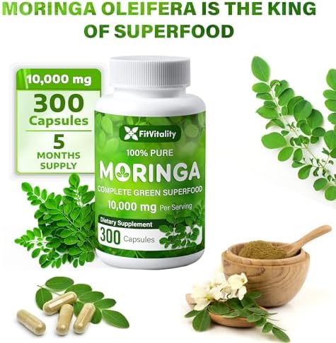 🌿 SUPERIOR POTENT FORMULA: Equivalent of 10,000 mg per serving – maximum strength. Our Moringa Capsules offer a convenient and effective way to incorporate this ancient herbal into your daily routine – 300 vegan capsules – 150 days supply.