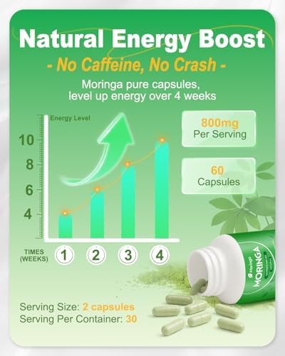 Moringa Capsules 800mg – Pure Moringa Powder Supplement for Energy, Immune, Skin & Gut Health – Caffeine-Free, Non-GMO Green Antioxidant Superfood 60 Vegan Capsules