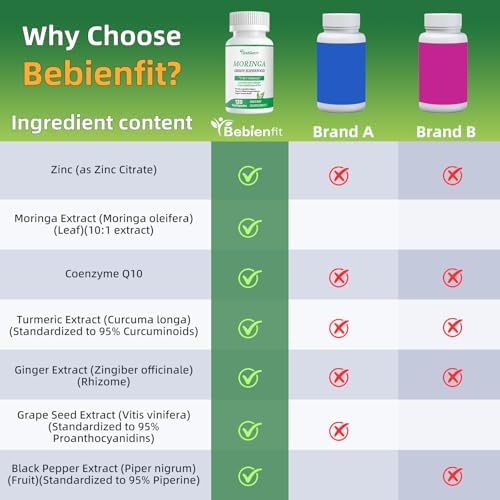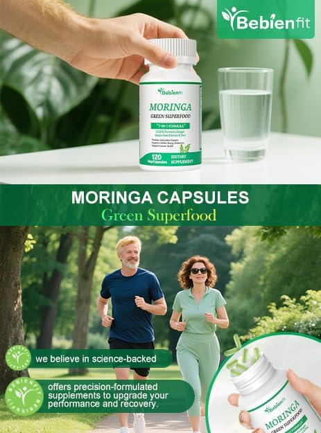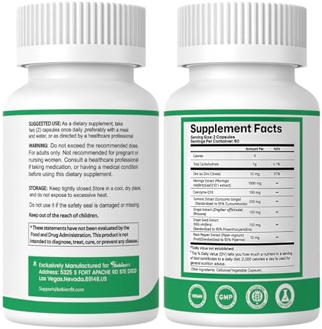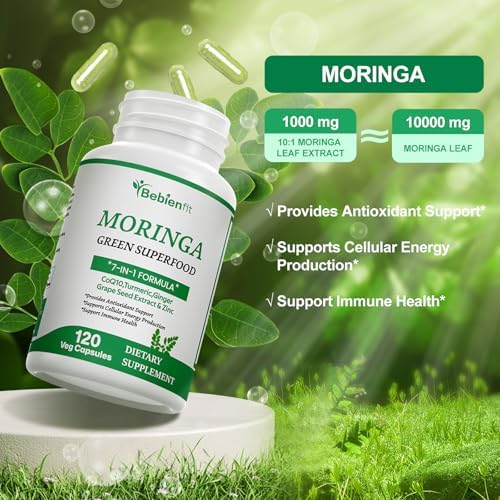 💪7-in-1 Powerful Moringa Blend – Bebienfit moringa capsules includes Pure Moringa Extract 1000mg , CoQ10 100mg , Turmeric 230mg, Ginger 130mg, Grape Seed Extract 150mg, Zinc 10mg , Black Pepper 10mg.