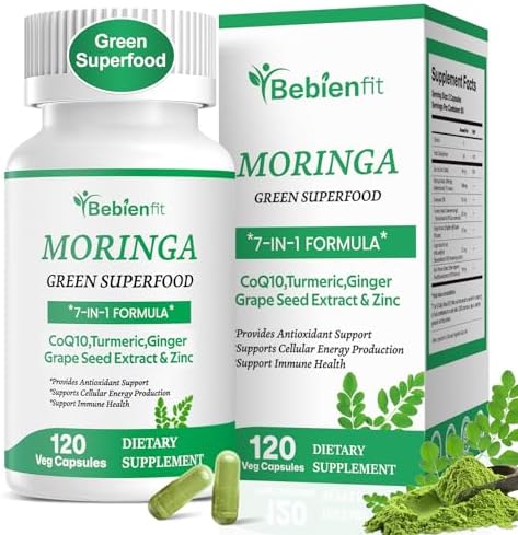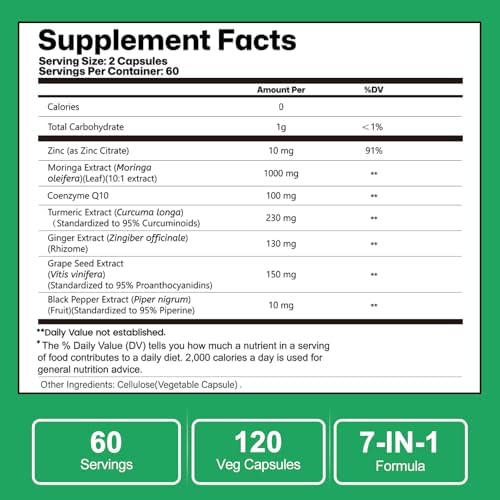 Home Natural and Herbal wellness Moringa Moringa Capsules, Natural Antioxidant Supplement for Energy/Skin/Immune Health,Green Superfood, 7-in-1 with CoQ10 / Turmeric/Grape Seed Extract/Zinc/Pure Moringa Extract,Non-GMO Vegan,120 Vegan Caps