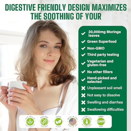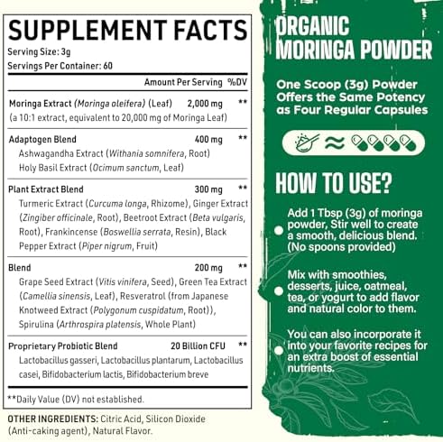 Digestive friendly: To avoid the intestinal irritation caused by pure Moringa leaf supplement, our Moringa leaf powder contains 20 billion probiotics and ginger extract for bloating health and optimizing absorption. Non GMO, vegan, and gluten free, ensuring overall well-being