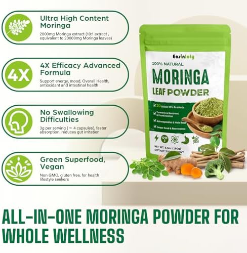 Green Superfood: Just 3g of Easinloty moringa powder per serving (equivalent to 4 capsules), no difficulty swallowing and no intestinal irritation, Enjoy faster absorption and the benefits of this nutrient-rich green superfood for moringa tea, moringa drink, Vegan-friendly