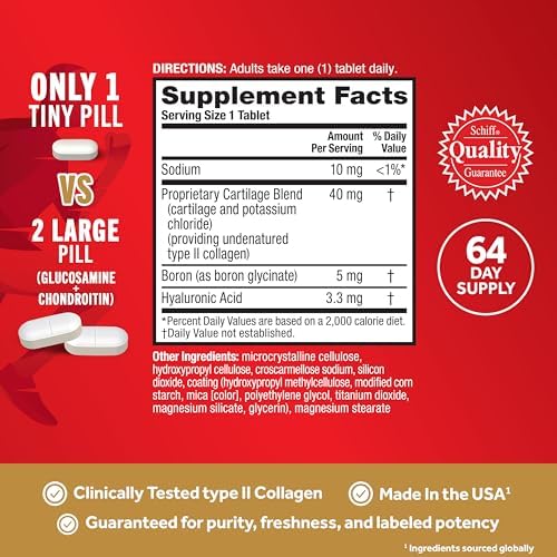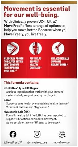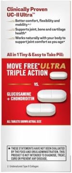 JOINT SUPPORT: Move Free Ultra features type 2 collagen to supports joint and cartilage health to deliver better flexibility, mobility, and joint comfort.* TRIPLE ACTION FORMULA: Provides joint, cartilage, and bone support in a single tiny tablet, making it an ideal supplement for those seeking help with daily movement.* CLINICALLY TESTED TYPE II COLLAGEN: Contains UC-II Ultra(R) collagen that works with your immune system to help support healthy cartilage and joint for better jonit comfort as you age.* BONE HEALTH SUPPORT: Boron helps maintain healthy levels of Vitamin D, Calcium and Magnesium, which support bone health. Plus healthy bones are key for healthy joints.* ONLY 1 TINY TABLET: These joint support supplement tablets are made with your convenience in mind. Only take 1 tiny easy-to-swallow tablet a day for the best results. FOR MEN AND WOMEN: These collagen pills for woman and men are great joint supplements for women and men who are active in sports or facing daily normal joint wear and tear.* DEVELOPED BY SCIENTISTS: The MOVE FREE product family with clinically tested ingredients, offers a range of solutions to help you move better. Because when you MOVE FREE-ly, you live freely. * These statements have not been evaluated by the Food and Drug Administration. This product is not intended to diagnose, treat, cure or prevent any disease.