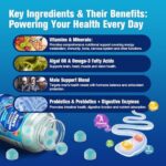Omega-3 + 60 Billion CFU Probiotics: Multivitamins for men, includes 320mg of Omega-3 fatty acids (DHA & EPA) for brain and heart health, plus a powerful probiotic blend to support digestive function and overall immunity.