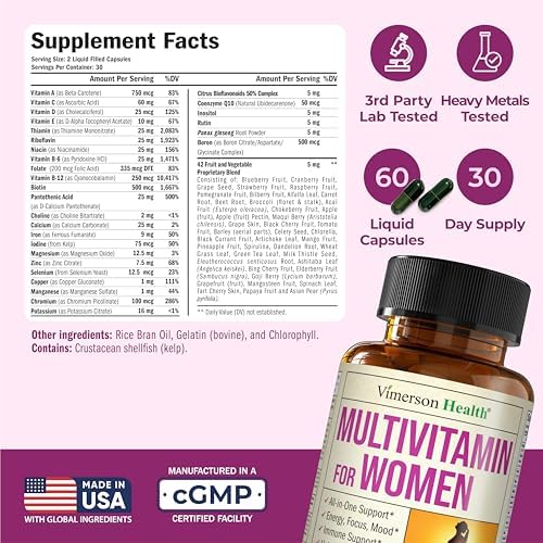 Discover our premium Multivitamin for Women – designed specifically as daily Vitamins for Women. Vimerson Health’s Womens Multivitamin with Iron is a complete Multimineral for Women of all ages. Essential Nutrients to support Overall Health in just 2 easy-to-absorb liquid caps a day.*