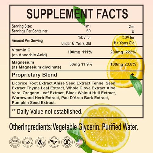 Home Child health Immune boosters Natural Herbal Gut Support for Kids and Adults,Supports Body Cleansing, Immune Support,Improve Concentration,Vitamins C & Magnesium Glycinate,Sugar-Free (60ml, Lemon)