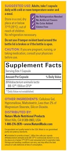 Nature Made Probiotic Capsules are a daily probiotic supplement with 1 Billion CFU from Live Cultures. Clinically studied men and womens probiotic BB-12 supports digestive health, promotes regularity and supports a healthy immune system. These probiotics for men and women are gluten free with no artificial flavors, no color added and no refrigeration needed. Adults, take 1 capsule daily with cold or room temperature water and a meal. Store in a cool, dry place at or below 77°F (25°C), out of reach of children. Get high-quality probiotics for women digestive health and probiotics for men from Nature Made. (1)Formulated to provide at least 1 billion live cells per capsule Bifidobacterium animalis lactis BB-12 if continuously stored in a cool, dry place at or below 77°F (25°C) and consumed prior to expiration date. Storage and handling conditions can vary, and may affect the total amount of cells delivered at time of consumption. *Based on a 2024 survey of pharmacists who recommend branded vitamins and supplements. These statements have not been evaluated by the Food and Drug Administration. This product is not intended to diagnose, treat, cure, or prevent any disease.