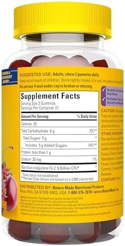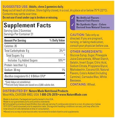 Nature Made Extra Strength Digestive Probiotics Gummies are dietary supplements that help support a healthy digestive system, which is important for overall health and wellness. Sourced from high quality ingredients, this daily probiotic for women and men has no synthetic dyes and no artificial flavors. These adult probiotics for men and women are formulated to provide at least 8 billion live cells per 2 gummies(1) to help support digestive health. These men and women probiotics gummies come in delicious raspberry and cherry with other natural flavors. No refrigeration required, these probiotic gummies for adults are shelf stable and formulated to deliver 8 billion CFUs until the end of their shelf life(1). Adults, chew two Nature Made Probiotic gummies daily. A Nature Made mens and womens probiotic gummy is quality you can trust. (1)Formulated to provide at least 8 billion live cells per serving if continuously stored in a cool, dry place at or below 75°F (23°C) and consumed prior to expiration date. *Based on a survey of pharmacists who recommend branded vitamin and supplements. These statements have not been evaluated by the Food and Drug Administration. This product is not intended to diagnose, treat, cure or prevent any disease.