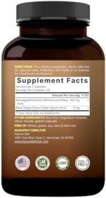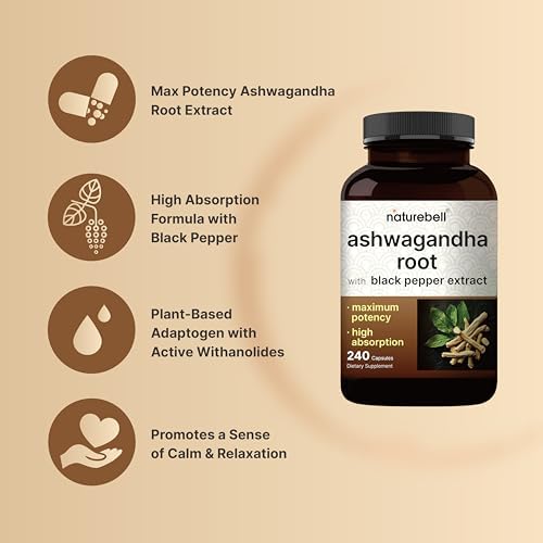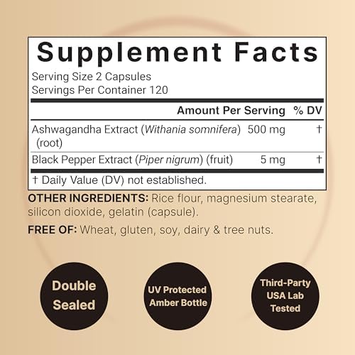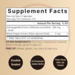240 capsules per bottle, 2 capsule serving size, delivering 12,500 mg ashwagandha herbal equivalent combined with 5 mg black pepper per dose, 4-month supply.
