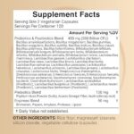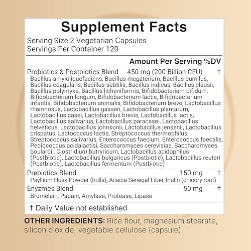 Full spectrum 5-in-1 digestive enzyme, prebiotic, probiotic, postbiotic, and fiber complex, 240 veggie capsules that offer 120 servings per bottle with maximum potency 200 billion CFU (colony forming units).