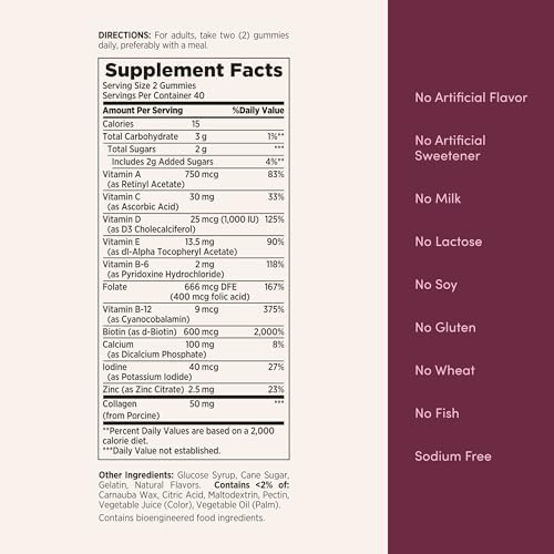Nature’s Bounty Optimal Solutions Women’s Multivitamin Gummies offers a unique formula ‘ created for women’ to provide your body with over 10 key nutrients every day in a delicious raspberry and mixed berry flavored gummy. Nature’s Bounty Optimal Solutions Women’s Multivitamin Gummies provide you with the vital nutrients to support a healthy and beautiful body. (1) Each daily serving provides your body with antioxidant Vitamins E and C, Calcium for bone health and Vitamin D for immune health. (1) This daily vitamin supplements also offers 50 mg of Collagen per serving. Other key nutrients, like B Vitamins, provide cellular energy support by helping convert food into energy. (1) This multi vitamin and mineral supplement plus collagen has no artificial flavors or sweeteners. Adults can take two raspberry-flavored gummies per day, preferably with a meal. Each bottle of Nature’s Bounty Optimal Solutions Women’s Multivitamin Gummies contains 140 delicious raspberry flavored gummies.
